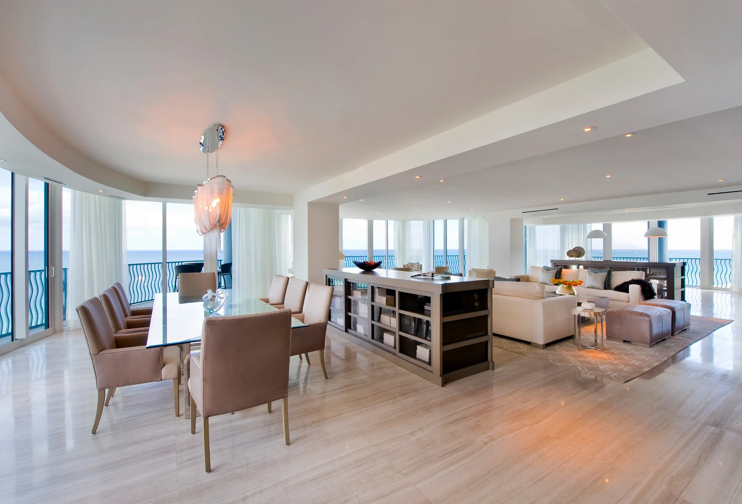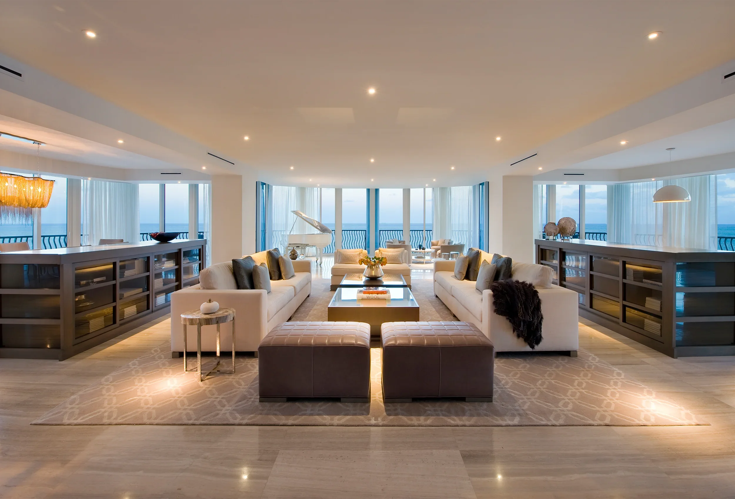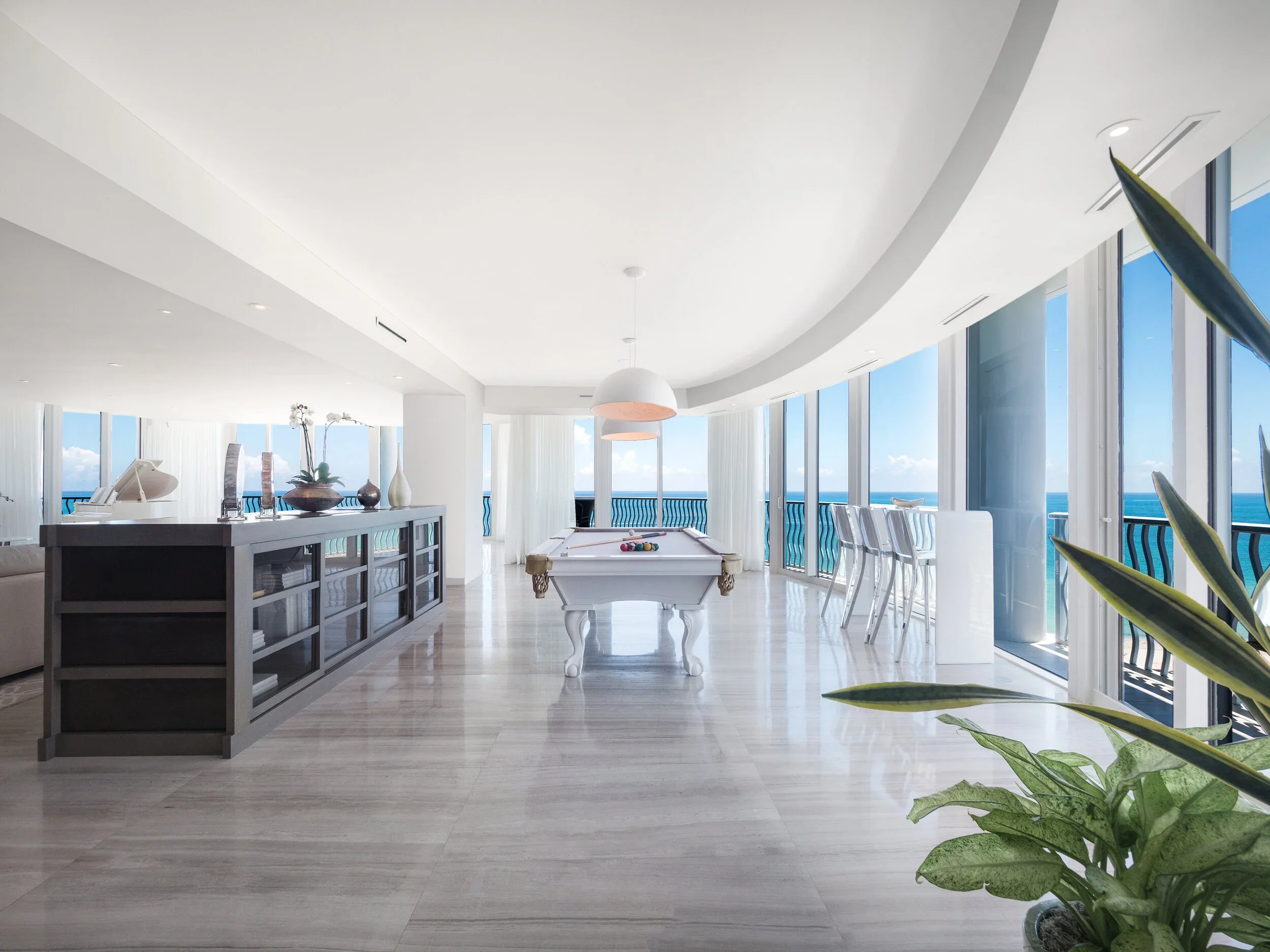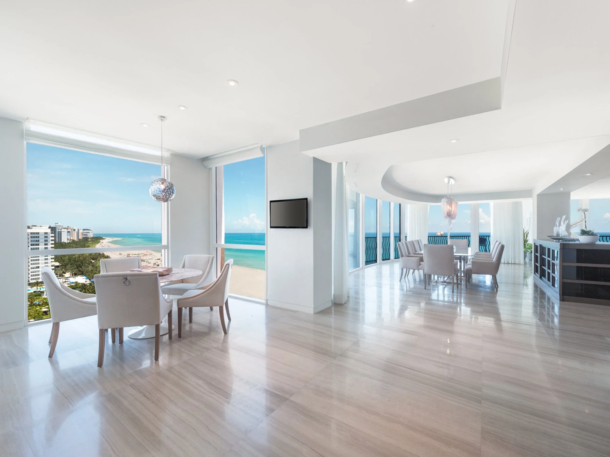 Custom millwork anchors the serene sophistication of this Ocean Drive penthouse. Seamless built-ins, architectural wall paneling, and precision-crafted details bring warmth and structure to the open, oceanfront expanse, balancing contemporary minimalism with timeless craftsmanship.