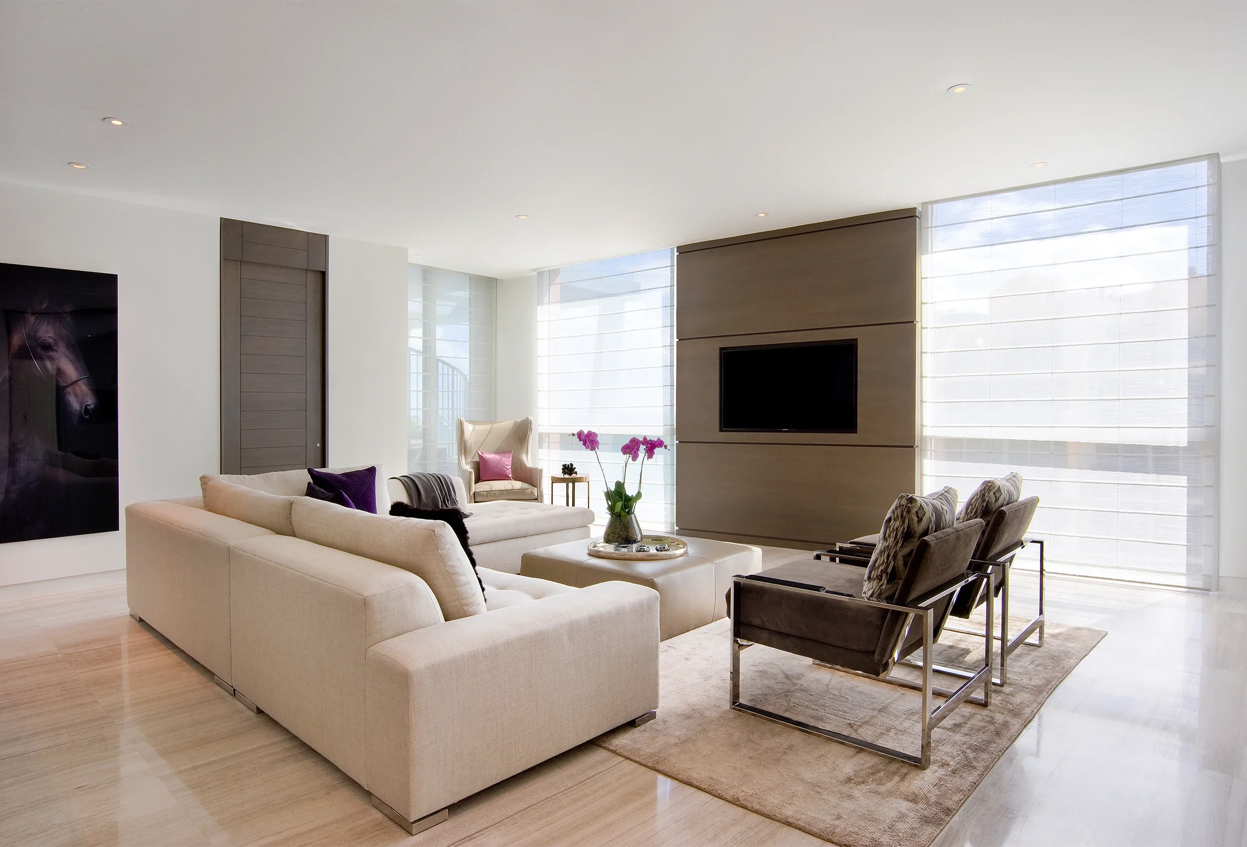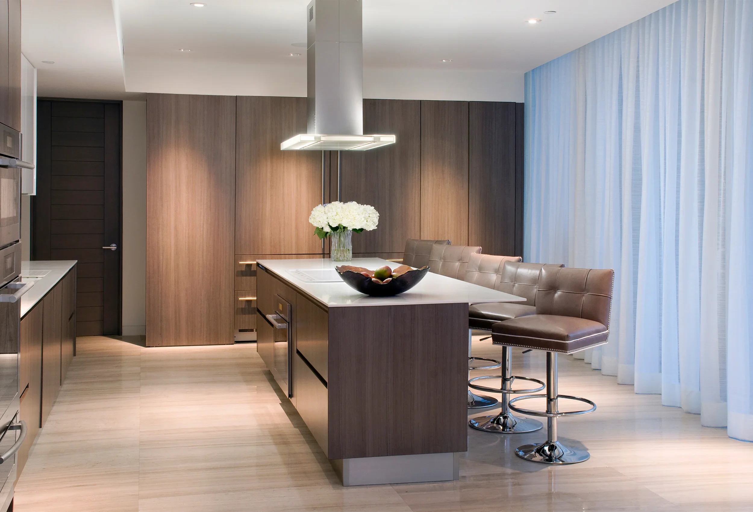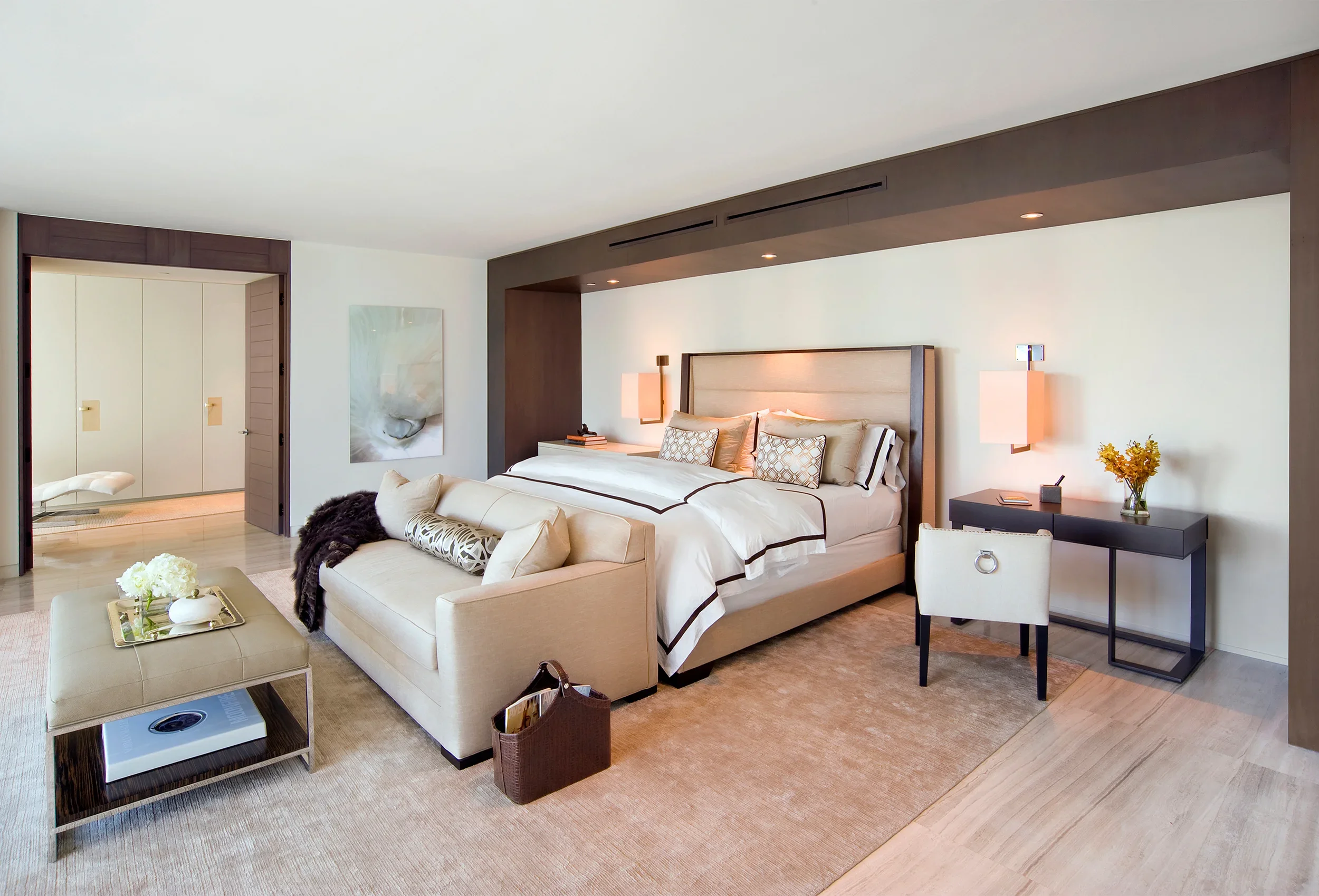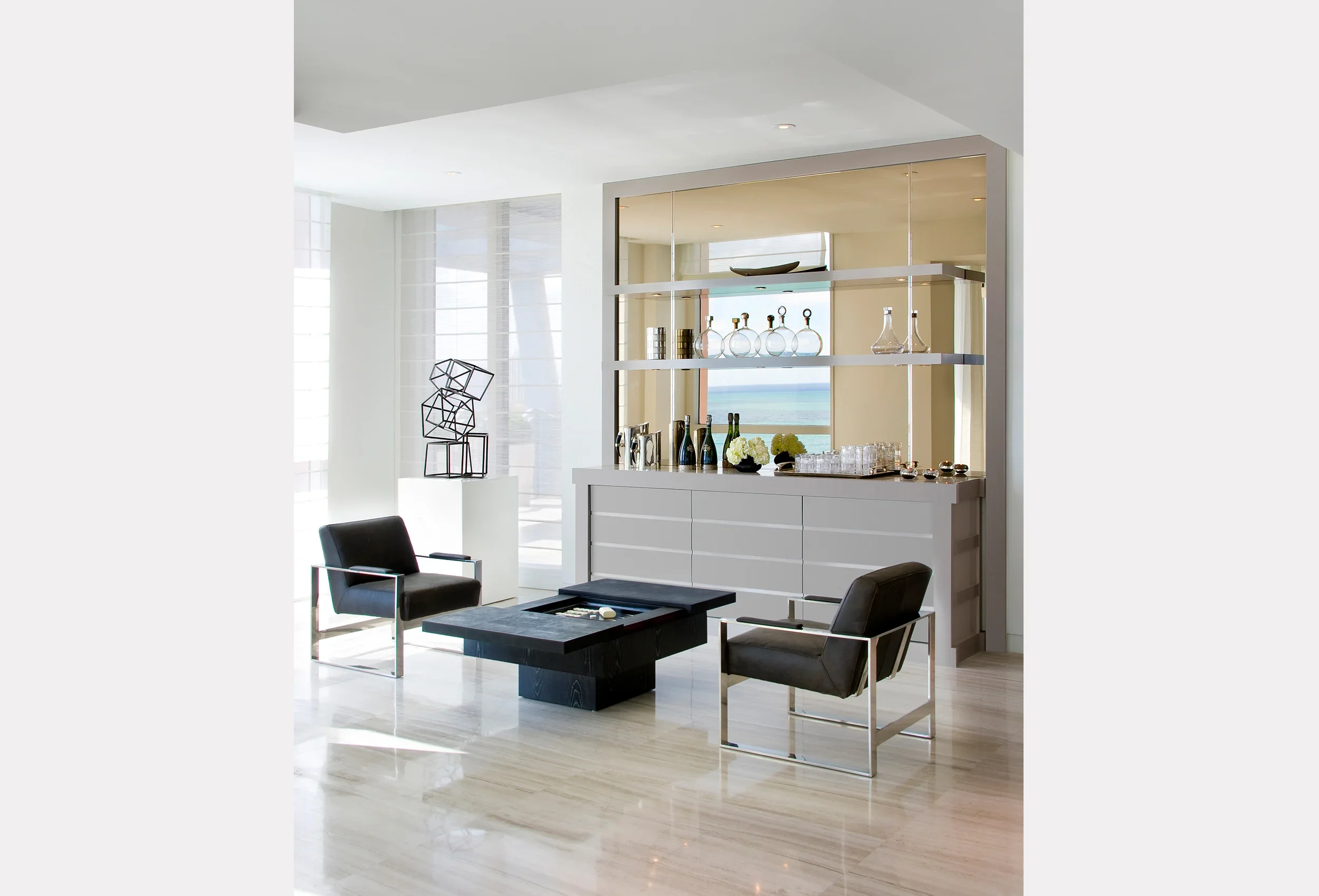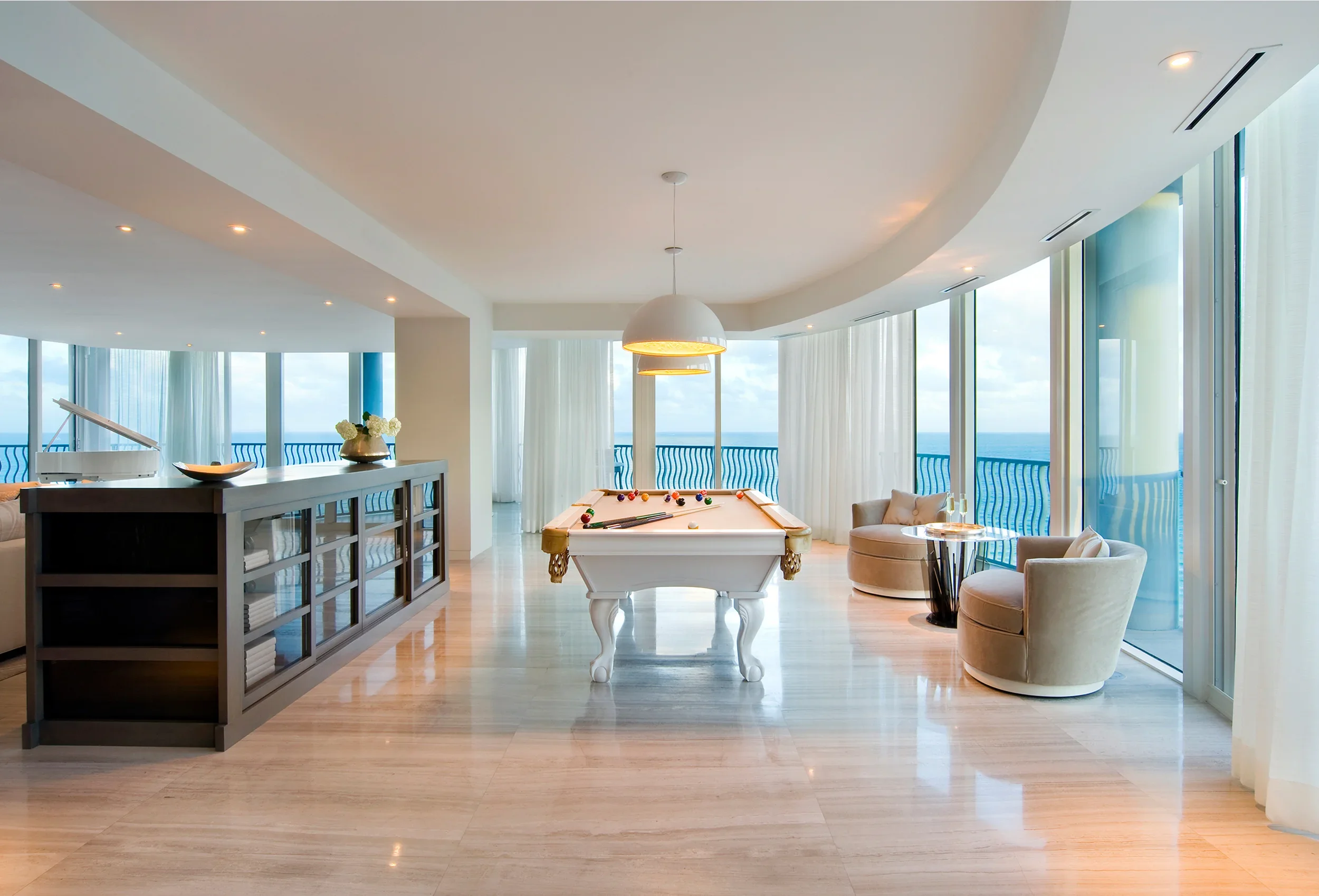 Custom millwork anchors the serene sophistication of this Ocean Drive penthouse. Seamless built-ins, architectural wall paneling, and precision-crafted details bring warmth and structure to the open, oceanfront expanse, balancing contemporary minimalism with timeless craftsmanship.